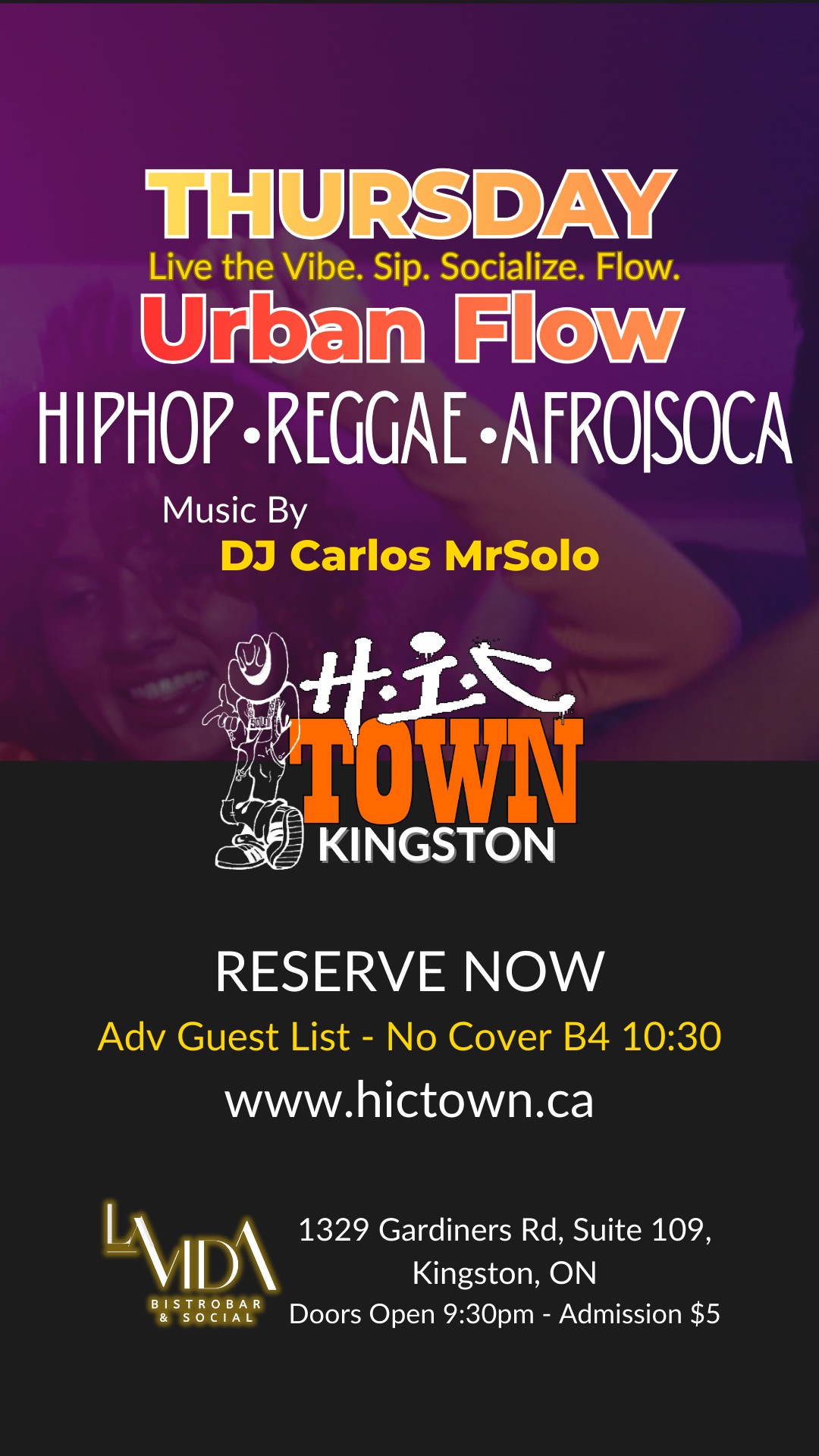 Kingston’s weekly Urban music escape comes alive every Thursday at The Loft inside La Vida Bistrobar & Social, bringing together a vibrant fusion of Hip Hop, RnB, Reggae, Afrobeats, and Soca. The vibe stays fresh, the crowd stays moving, and every week feels like its own celebration — the perfect spot to make Thursday nights your favourite ritual
